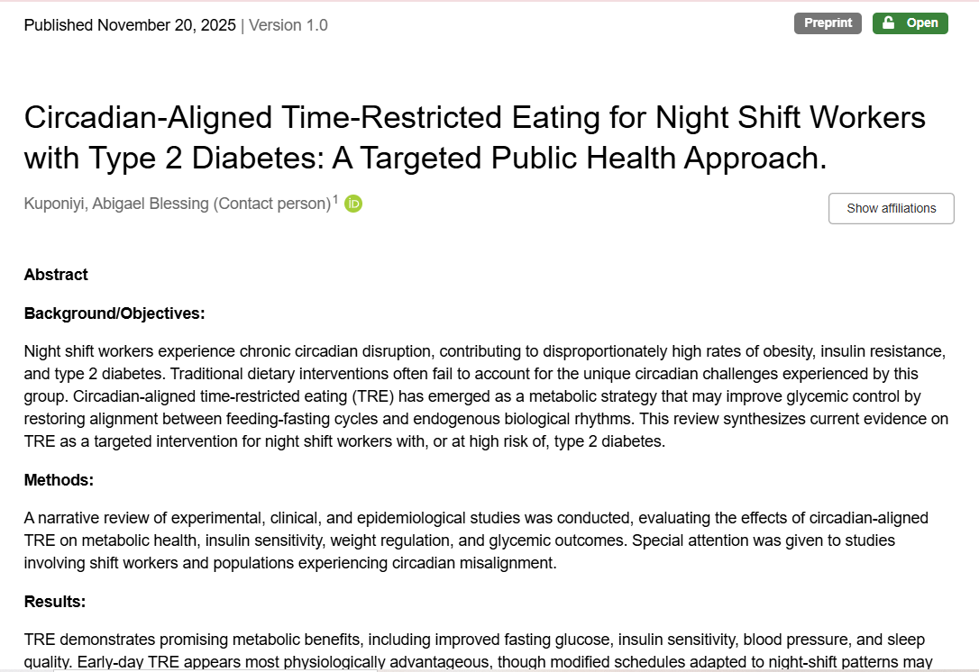 Night shift workers experience chronic circadian disruption, contributing to disproportionately high rates of obesity, insulin resistance, and type 2 diabetes. Traditional dietary interventions often fail to account for the unique circadian challenges experienced by this group.