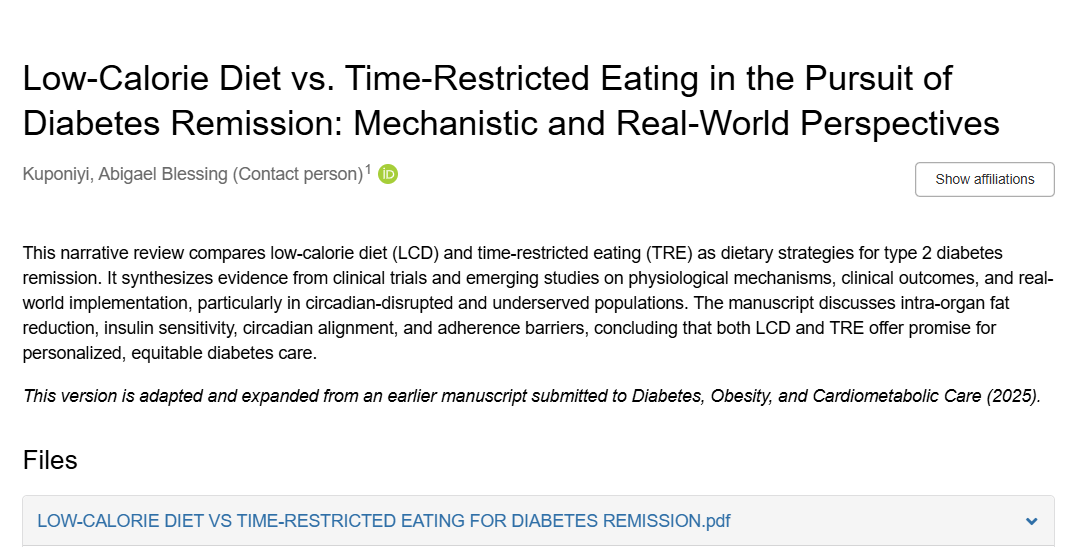 The manuscript discusses intra-organ fat reduction, insulin sensitivity, circadian alignment, and adherence barriers, concluding that both LCD and TRE offer promise for personalized, equitable diabetes care.